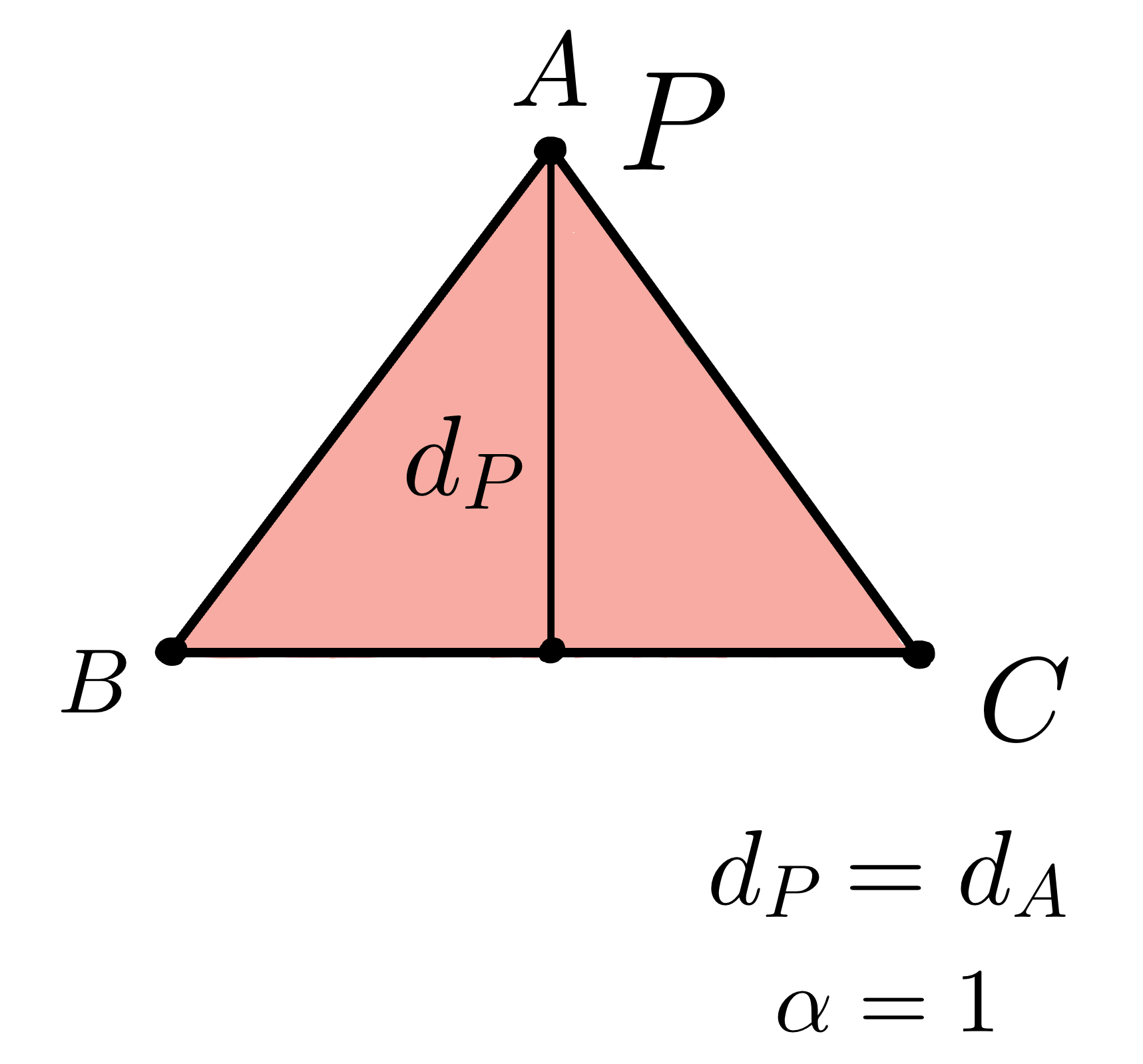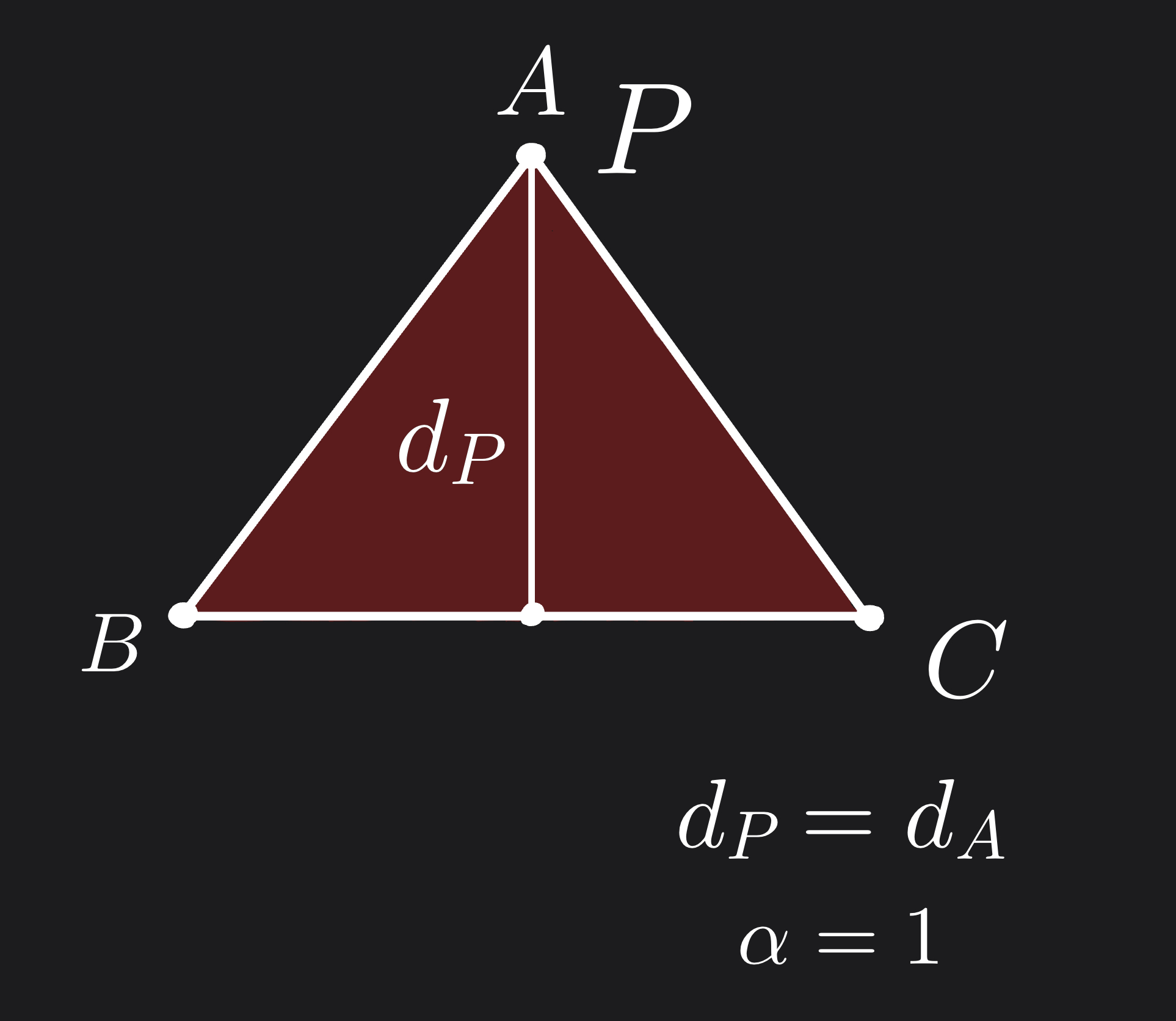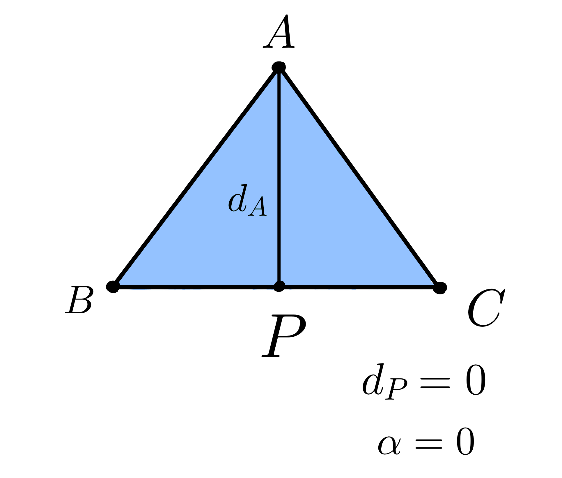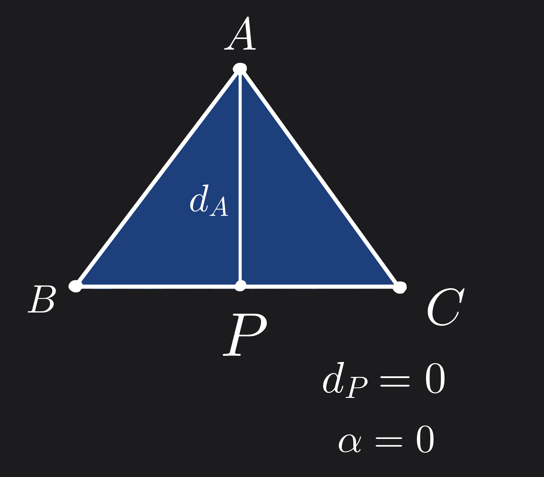 Similarly, as \(d_P\) decreases, the point \(P\) becomes closer to the edge \(BC\) and the value of \(α\) to also decrease. When \(d_P=0\), the point \(P\) lies on the edge \(BC\) and \(α=0\).