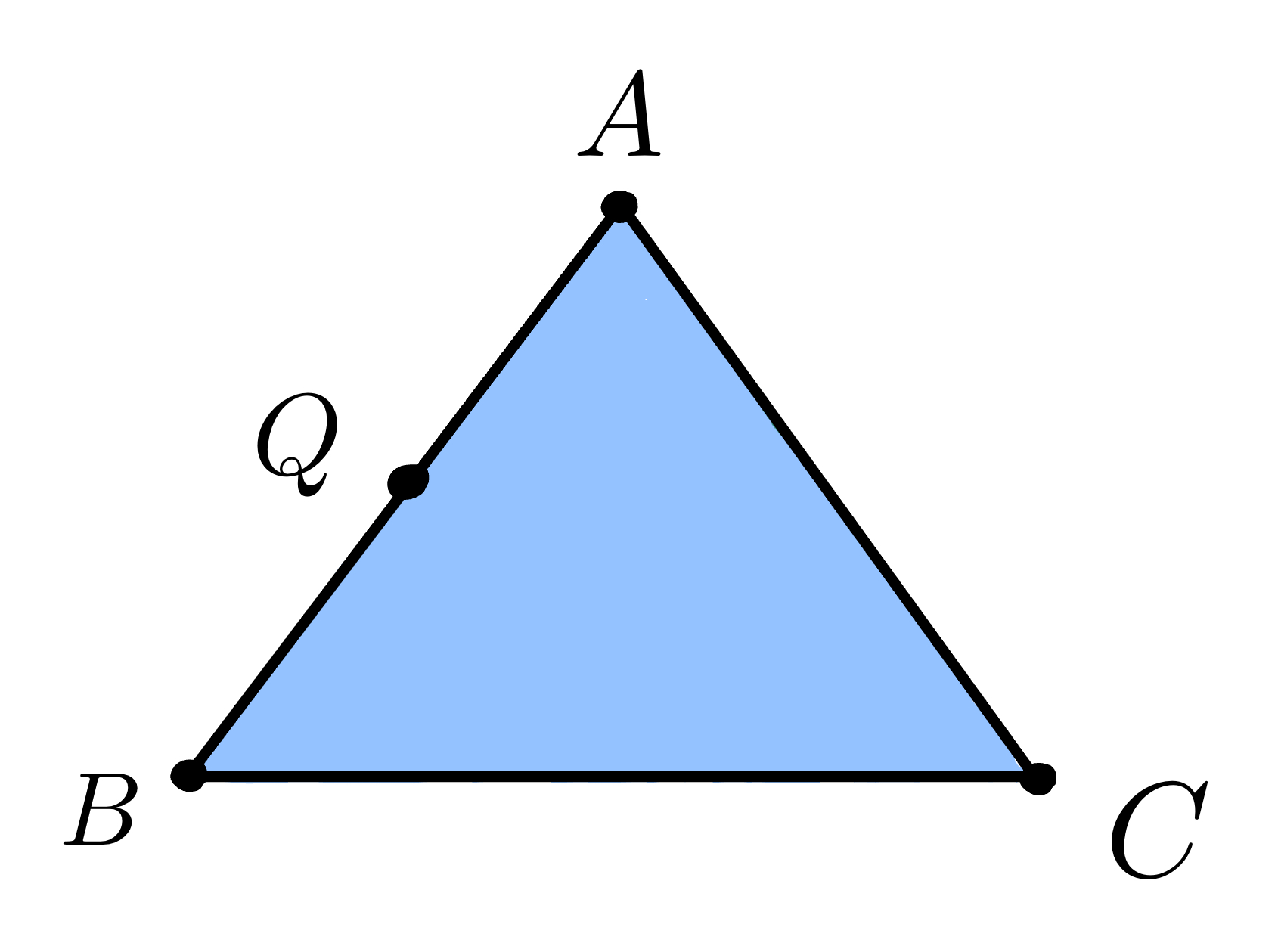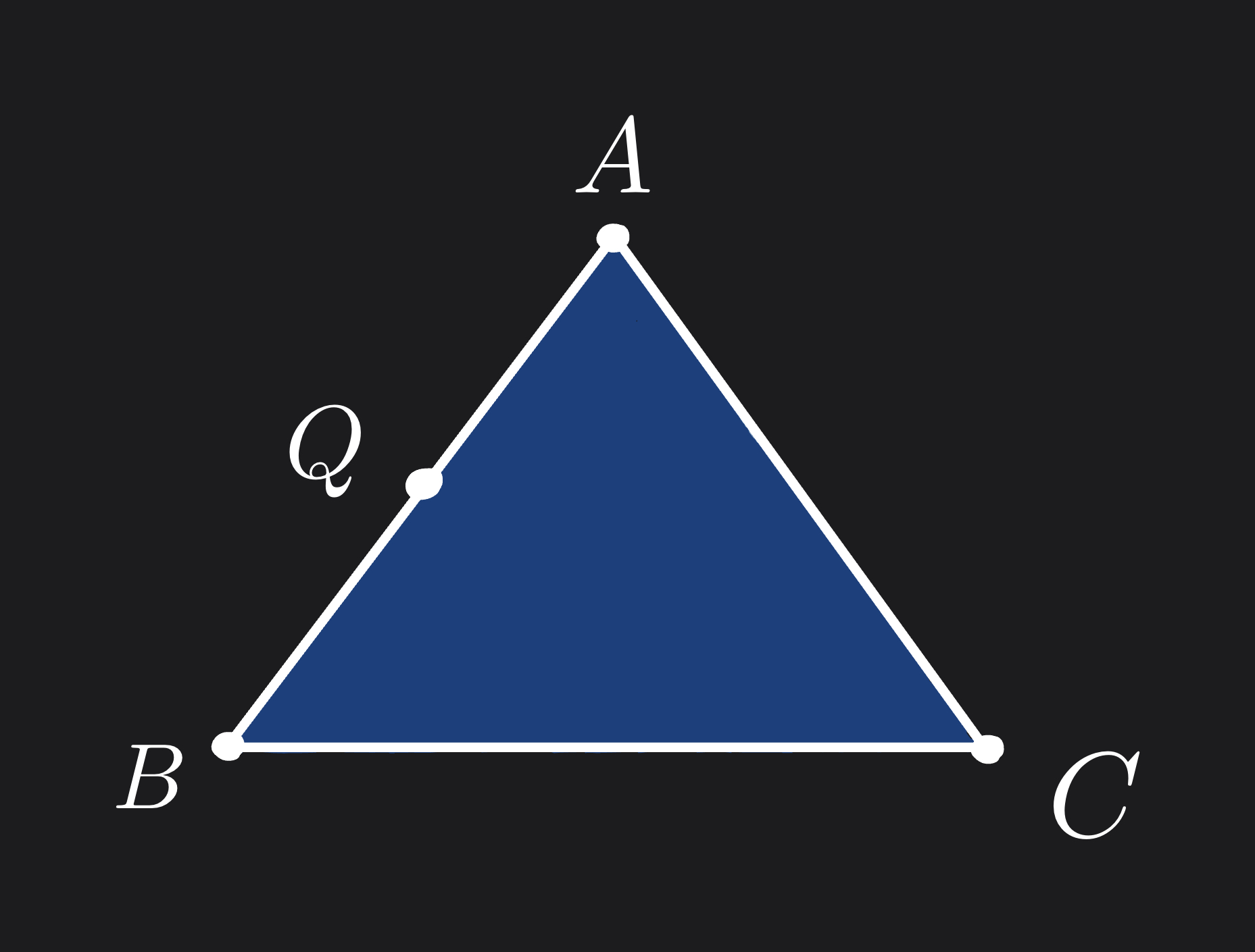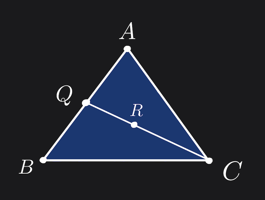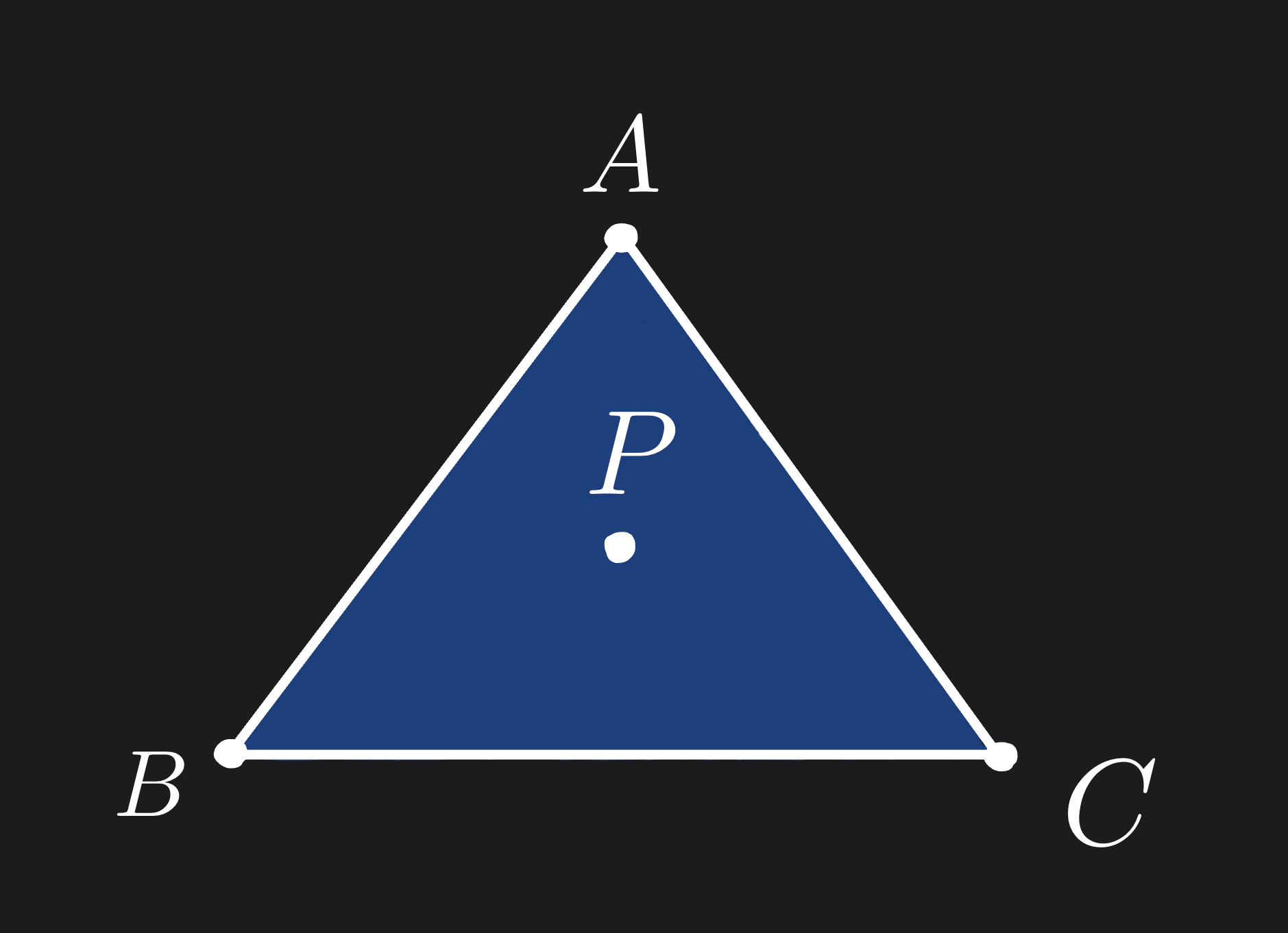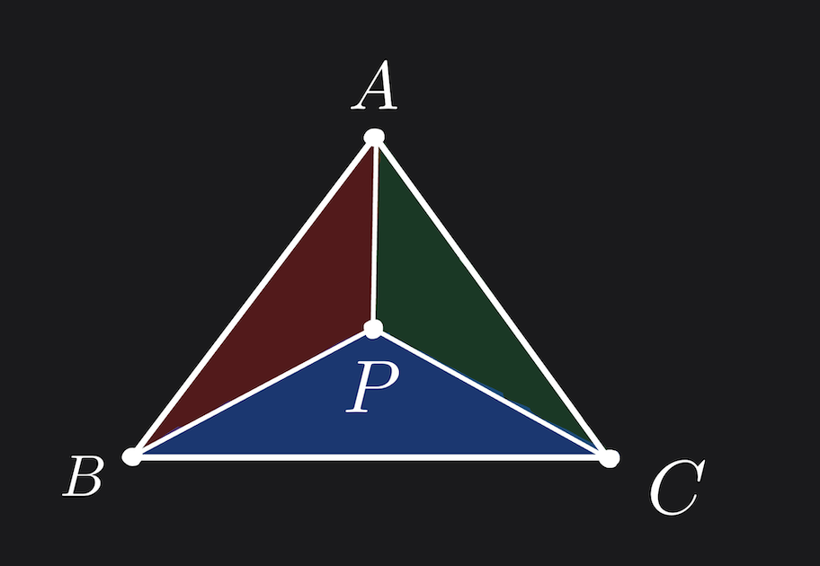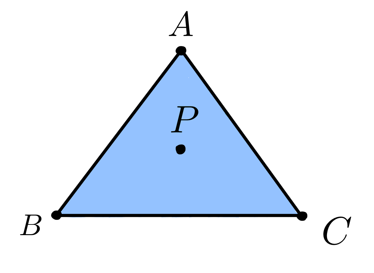 Let \(P\) be a point inside the triangle \(ABC\). We know that $$ P = αA + βB + γC $$ where \(α + β + γ = 1\) and \(α, β, γ \geq 0\).