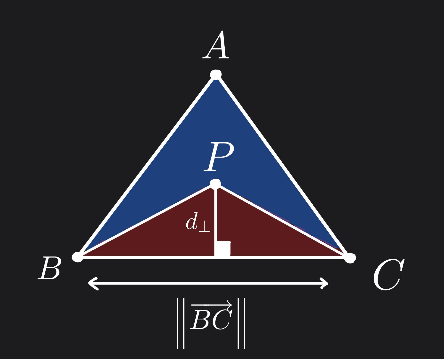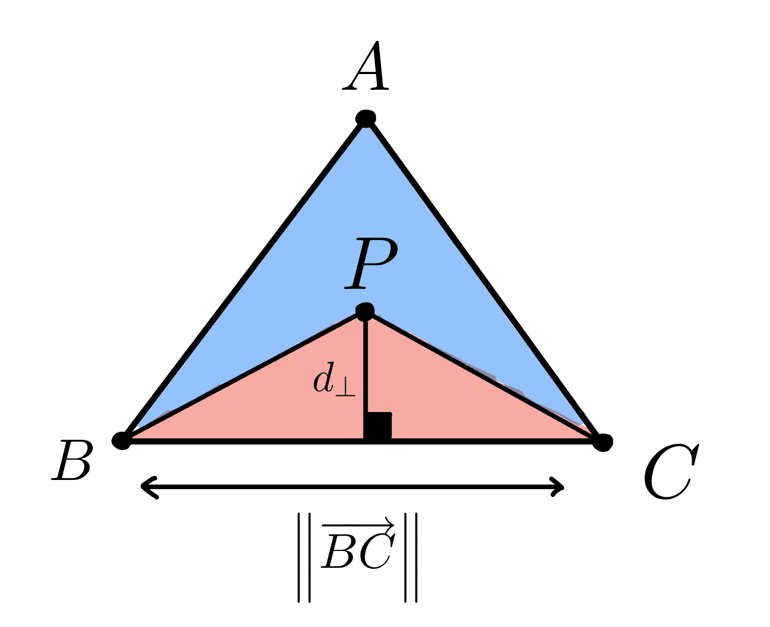The area of the triangle is $$ Area = \frac{1}{2} \;. \; Base \;. \; Height $$ where \(Height\) is the perpendicular shortest distance from the the base edge to the opposite vertex. For example, the area of triangle \(PBC\) is $$ Area(▲PBC) = \frac{1}{2} \; ||\vec{BC}|| \; d_{⊥} (P,BC) $$