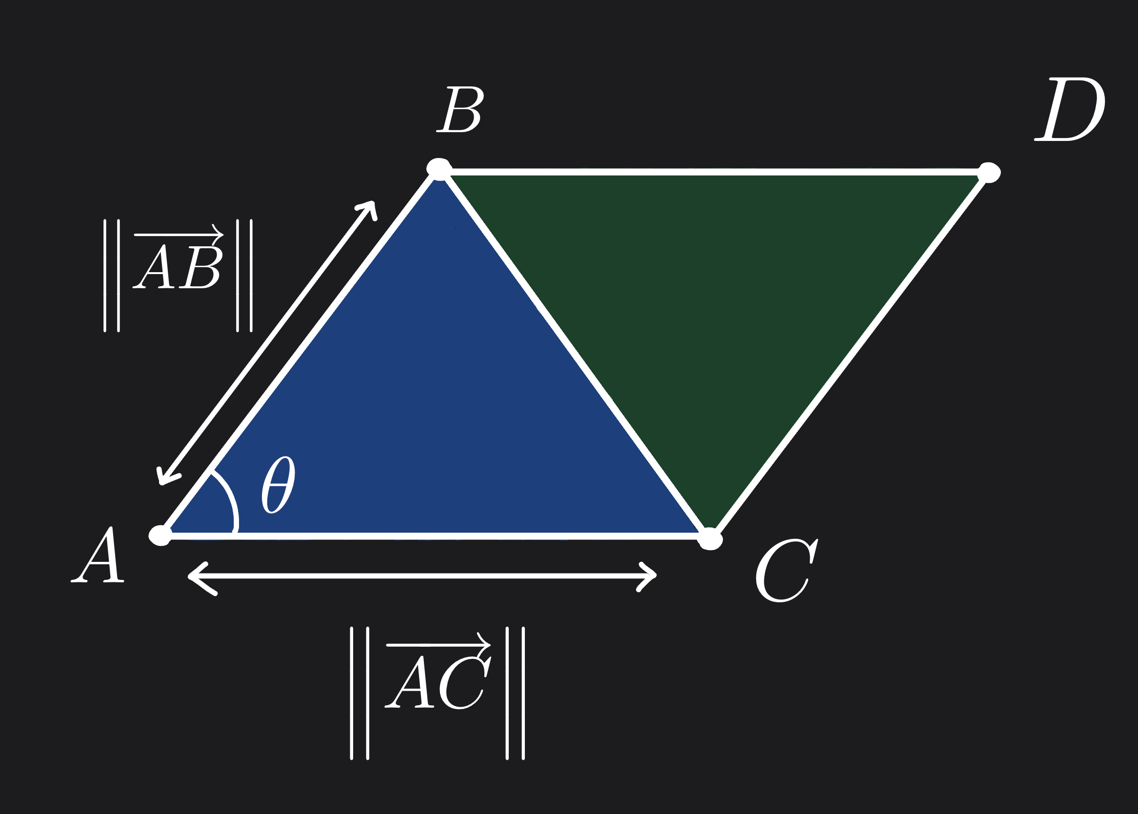 Another easier way to calculate the area of the triangle, is to use the area of the parallelogram. Consider the parallelogram \(ABCD\). The area of the parallelogram \(ABCD\) is $$ Area(▰ABCD) = ||\vec{AB}|| \; ||\vec{AC}|| \; sin(\theta) $$ We can also express the area of the parallelogram \(ABCD\) as the magnitude of the cross product of two vectors that lie on the parallelogram. That is, $$ Area(▰ABCD) = ||\vec{AB} \times \vec{AC}|| $$ The area of the triangle is equal to half the area of the parallelogram. Hence, the area of the triangle \(ABC\) can be expressed as $$ Area(▲ABC) = \frac{||\vec{AB}|| \; ||\vec{AC}|| \; sin(\theta)}{2} = \frac{||\vec{AB} \times \vec{AC}|| }{2} $$