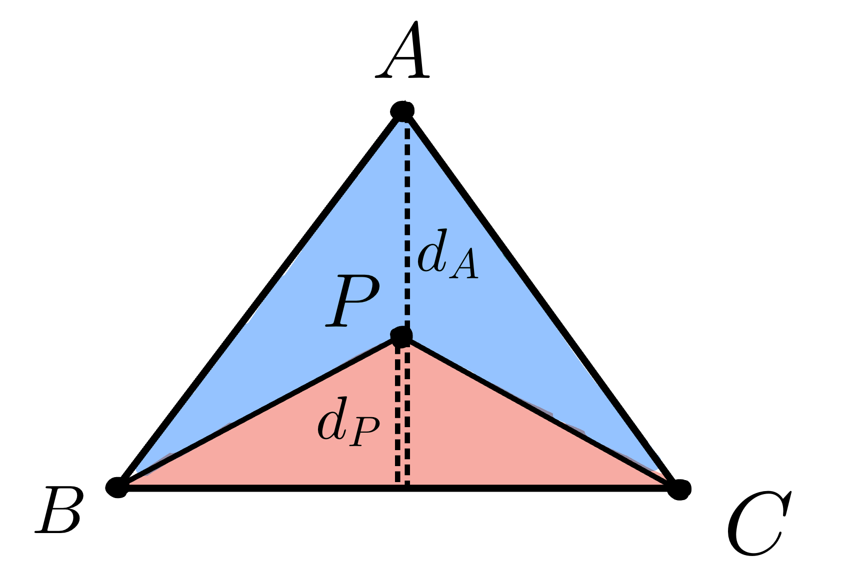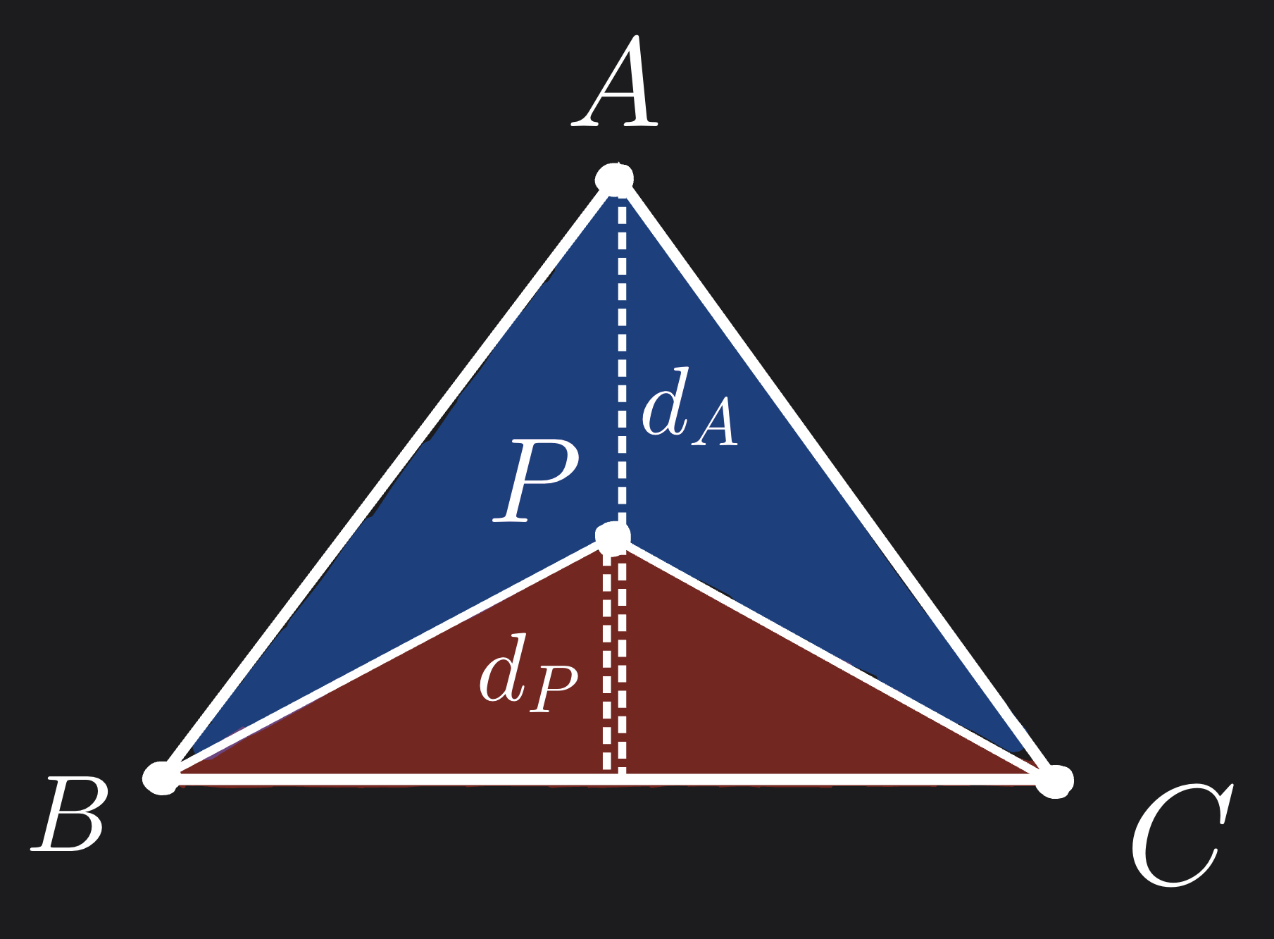 We know that the area of triangle \(PBC\) is $$ Area(▲PBC) = \frac{1}{2} \; ||\vec{BC}|| \; d_P $$ and the area of triangle \(ABC\) is $$ Area(▲ABC) = \frac{1}{2} \; ||\vec{BC}|| \; d_A $$