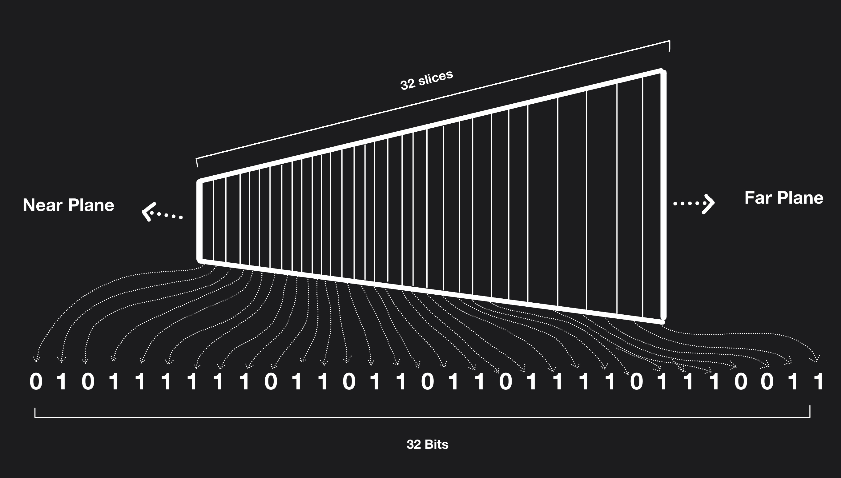 The depth range can be sliced either linearly, in which all slices are equal, logarithmically, in which cells get bigger as it approaches the far plane. Logarithmic slicing is preferred, since perspective projection causes depth values near the camera to be in high resolution than those far away. Having tiny slices near the camera allows finer seperation of geometry into seperate slices.
