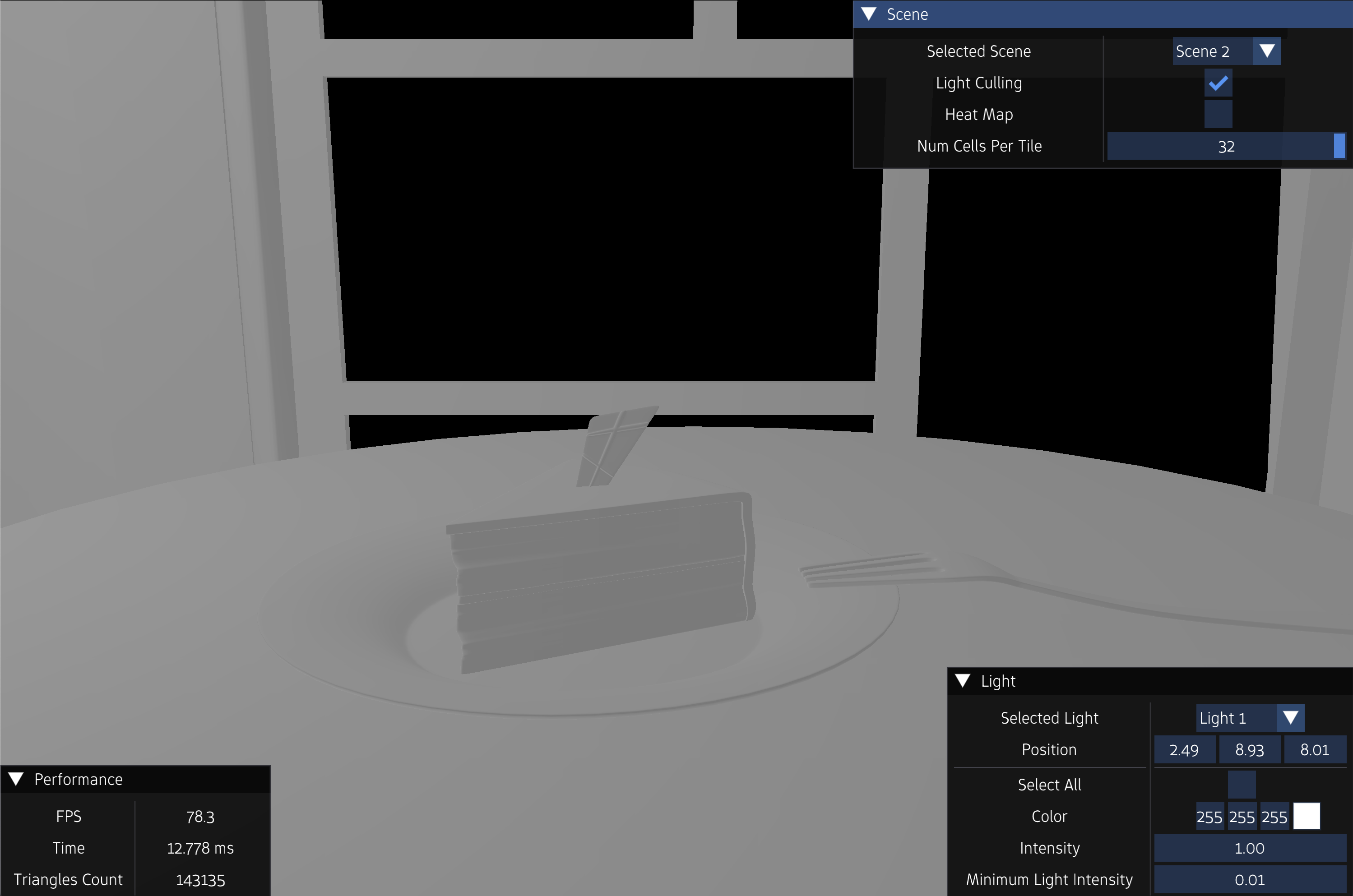 - A drop-down list to switch between different light culling algorithms: naive, and 2.5D light culling algorithms