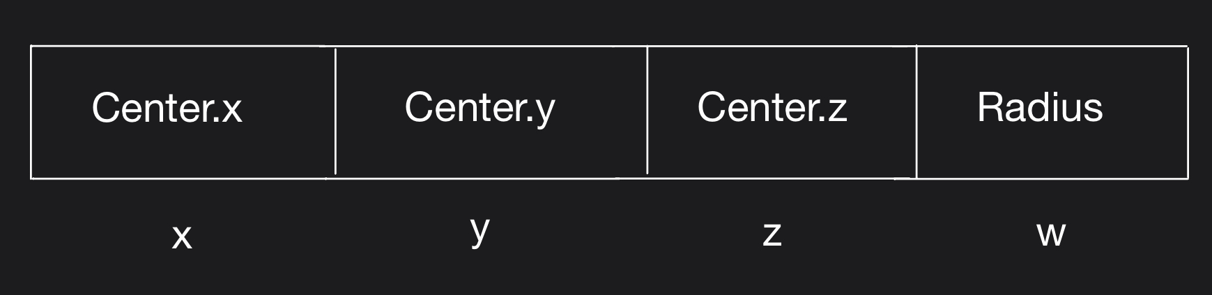 The data structure used to represent the bounding sphere is vec4. The XYZ component of the vector will contain the center of the sphere and the W component will contain the radius of the sphere.
