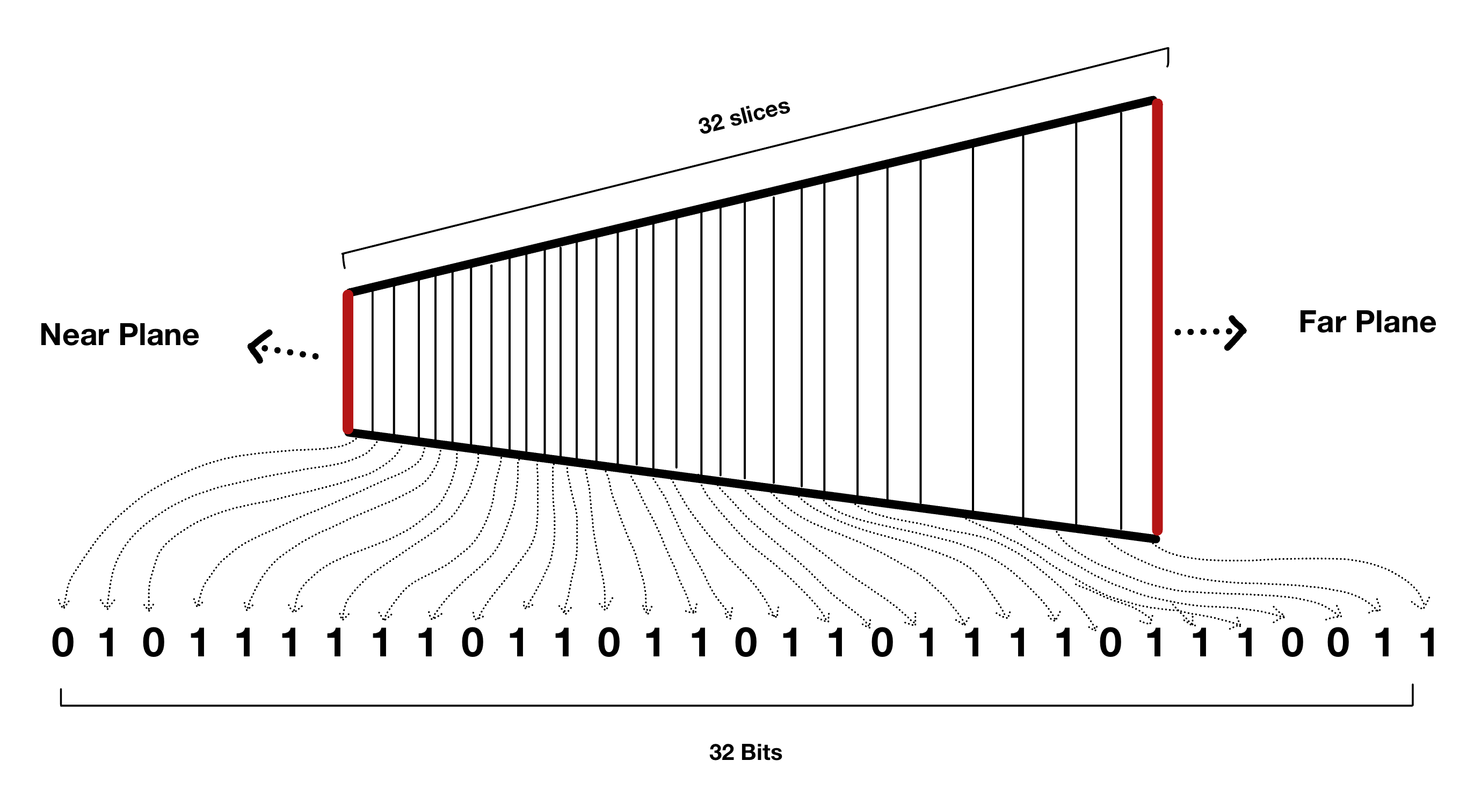 A typical way to represent cells in the depth range is the use of the bits within a variable. That is, each bit within the variable represents a cell in the depth range. If the bit is \(0\), then that cell is empty. Otherwise, the cell is occupied.