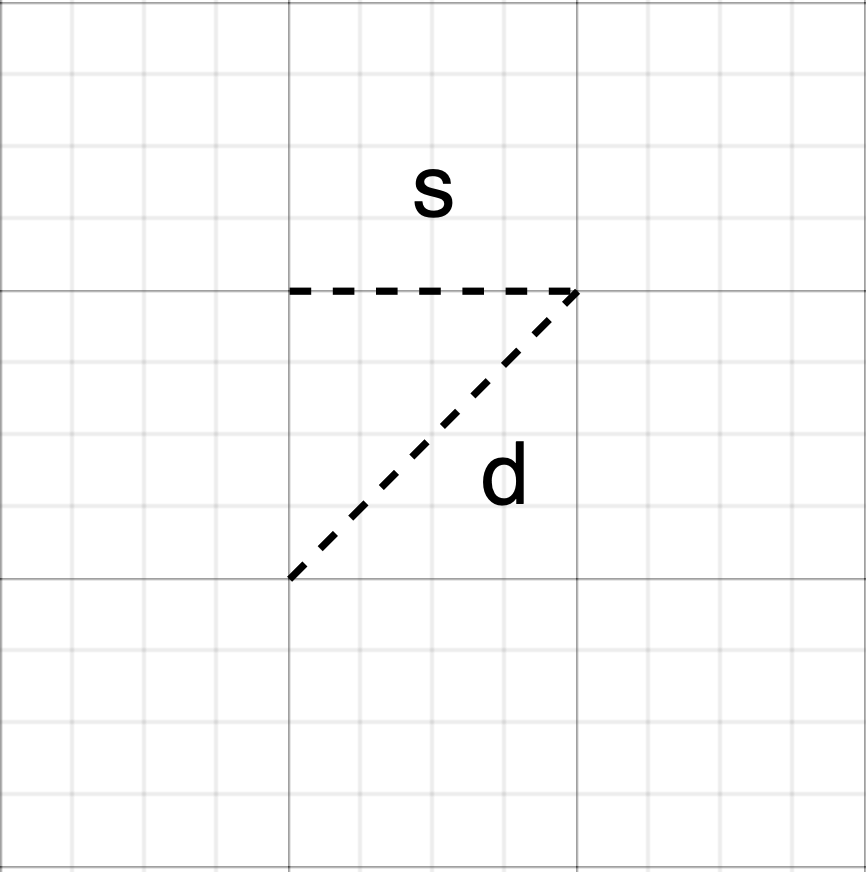 Now, using Pythagoras theorem: $$ d^2 = s_1^2 + s_2^2 + ...... + s_n^2 = n \; s^2 $$ $$ s^2 = \frac{d^2}{n} $$ $$ s = \sqrt(\frac{d^2}{n}) = \frac{d}{\sqrt(n)} $$ Since \(d \leq r\), then $$ s \leq \frac{r}{\sqrt(n)} $$